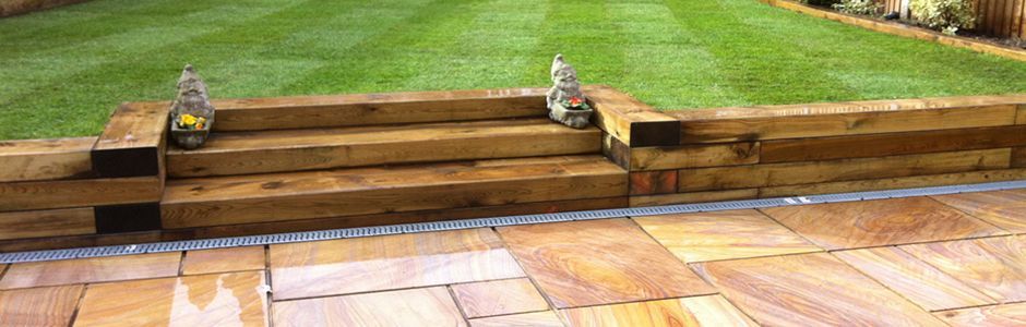 Patio installed, fence replaced raised garden, sleepers retaining walls,.